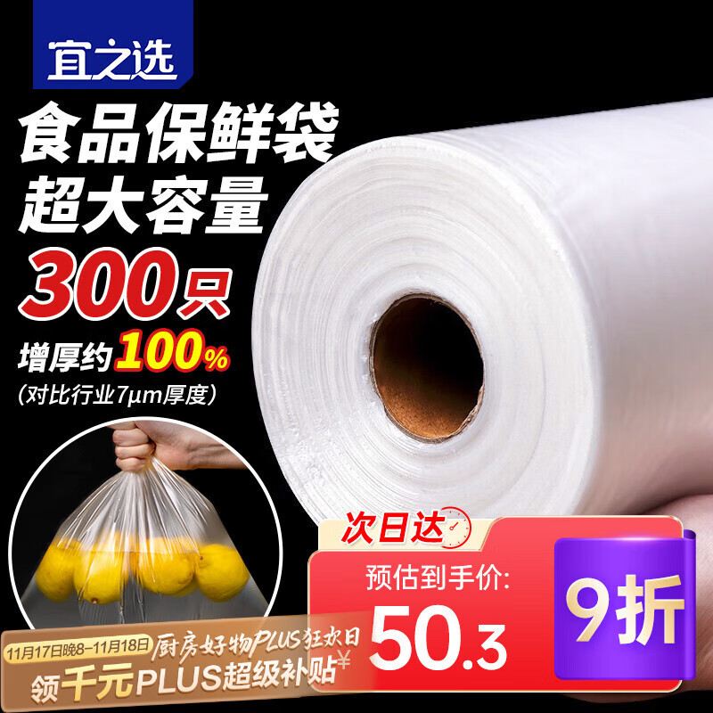 宜之选保鲜袋超大号45*35cm加厚300只食品级塑料袋商用超市点断式连卷袋
