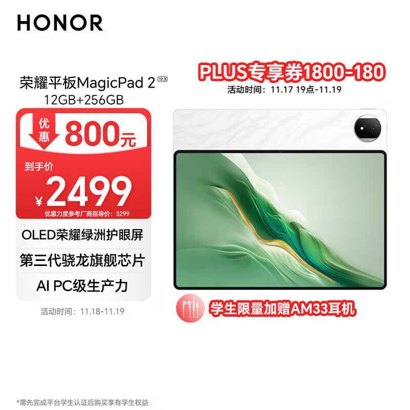 荣耀平板MagicPad2【国家补贴】12.3英寸平板电脑 OLED护眼屏 手机互联互通 PC级生产力12+256GB月影白