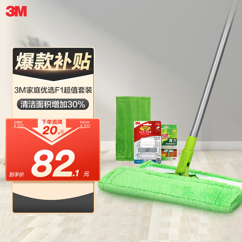 3M【实惠易清洁】 思高F1魔力洁地擦除尘去污干湿两用平板拖把CBG 99%家庭优选F1(共2个替换装+刮刀+拖把夹)