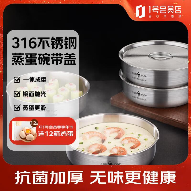 三四钢蒸蛋碗加厚316L不锈钢食品级带盖蒸鸡蛋羹1100ml 1号会员店