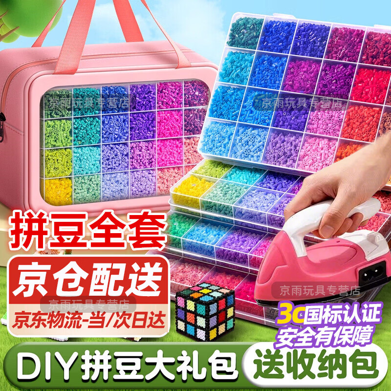 赫锦拼豆套装含熨斗全套工具拼豆豆手工diy材料包补充包玩具礼盒女孩 京仓发货-48色【粉熨斗3c认证+收纳包套装】送豆2000个