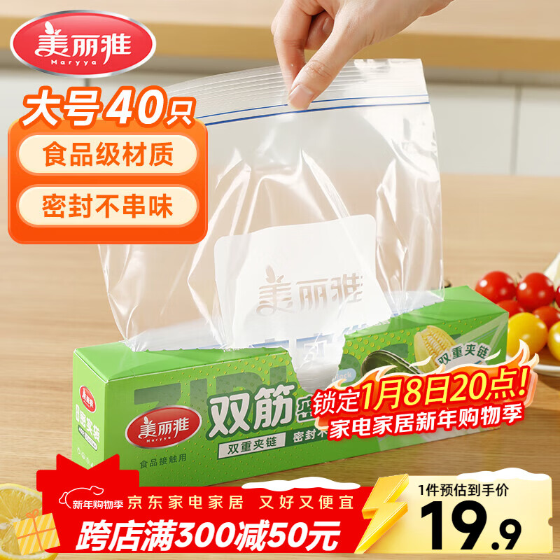 美丽雅密封袋食品级保鲜袋大号40只 加厚冰箱分装收纳密实自封袋