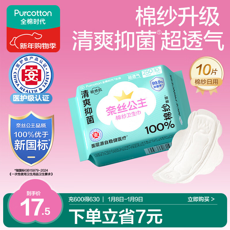 全棉时代奈丝公主医护级棉纱抑菌纯棉超薄日用卫生巾250mm10片/包京东自营
