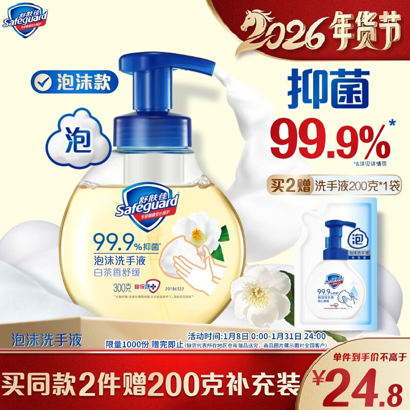 舒肤佳抑菌泡沫洗手液 白茶香300g 健康抑菌99.9% 泡沫细腻