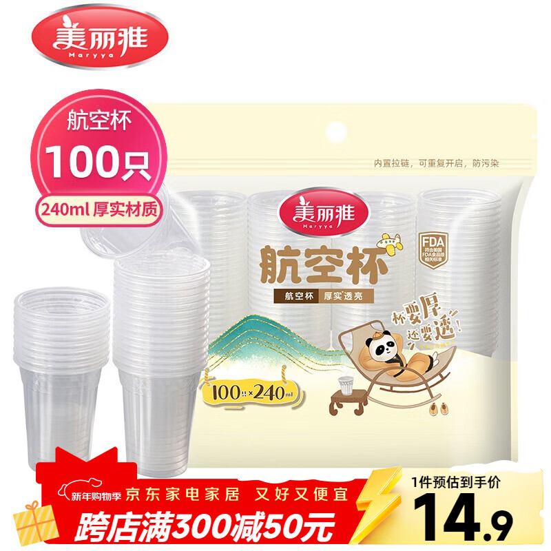 美丽雅一次性杯子塑料杯240ml*100只 加厚水杯茶杯饮料航空杯