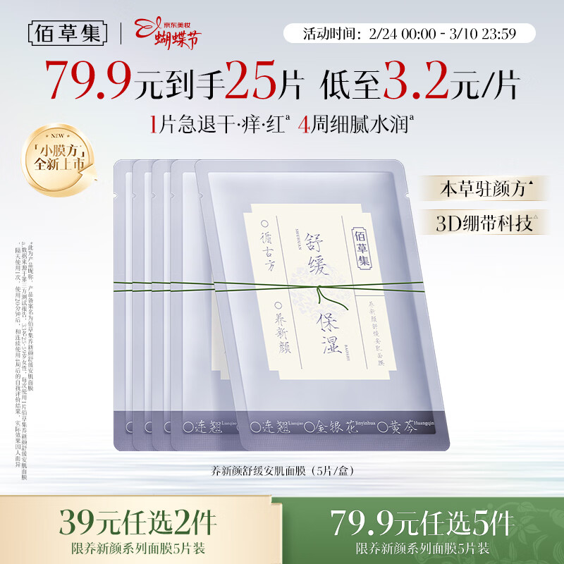 佰草集养新颜舒缓安肌面膜5片补水保湿褪红温和舒缓护肤男女女神节礼物