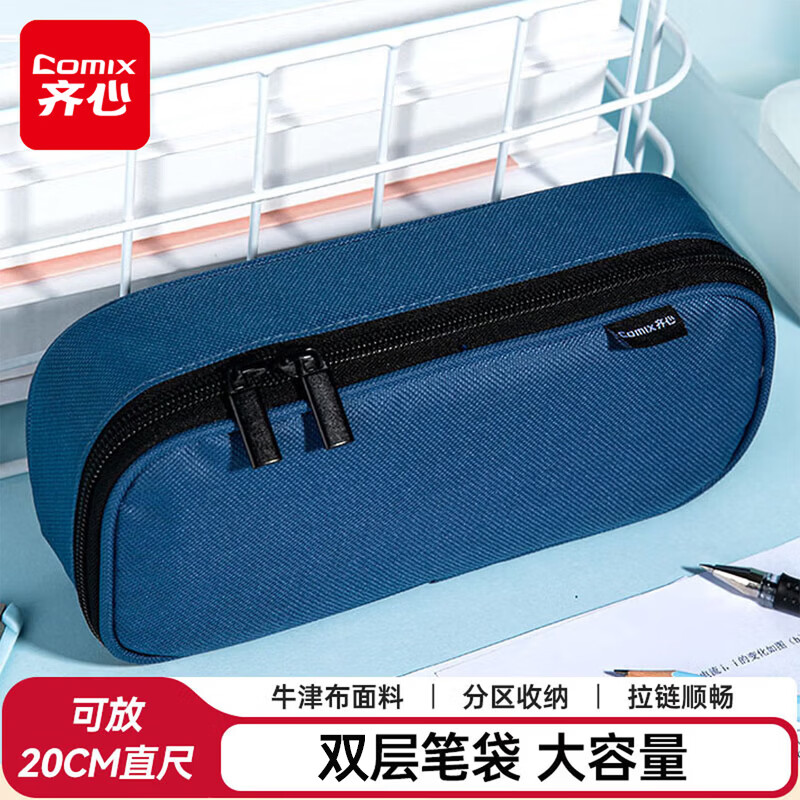齐心笔袋学生大容量文具盒 小学生便携铅笔盒收纳盒 分层收纳牛津布耐磨XS-30蓝