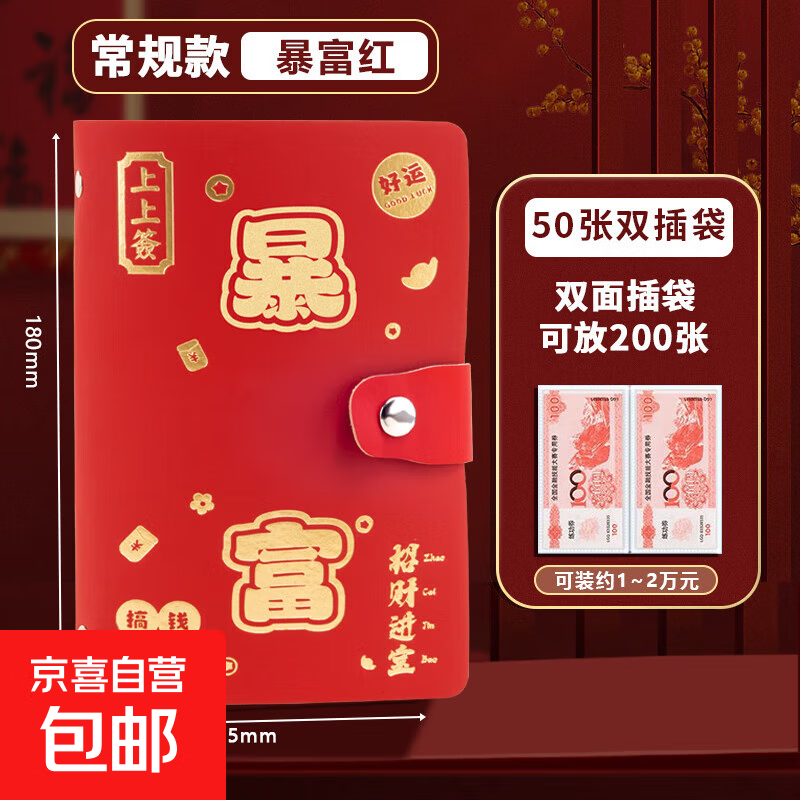 现金存钱本防水皮革收纳册纸币收藏册攒钱存钱包1-2万存钱夹大容量儿童理财手账带锁 【按扣存钱本】暴富红