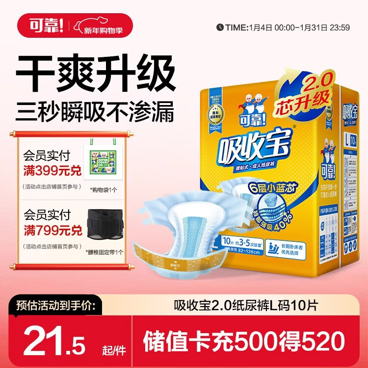可靠(COCO)吸收宝2.0成人纸尿裤L10片臀围95-120cm芯升级老年人孕产妇尿不湿