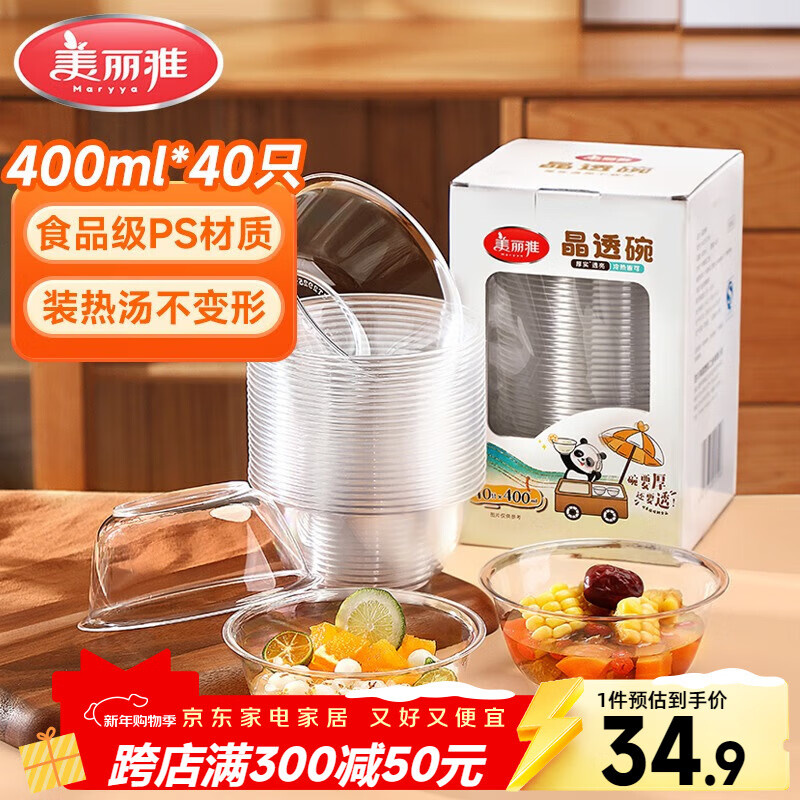 美丽雅一次性碗食品级400ml*40只 耐高温航空水晶碗野餐塑料方便汤碗