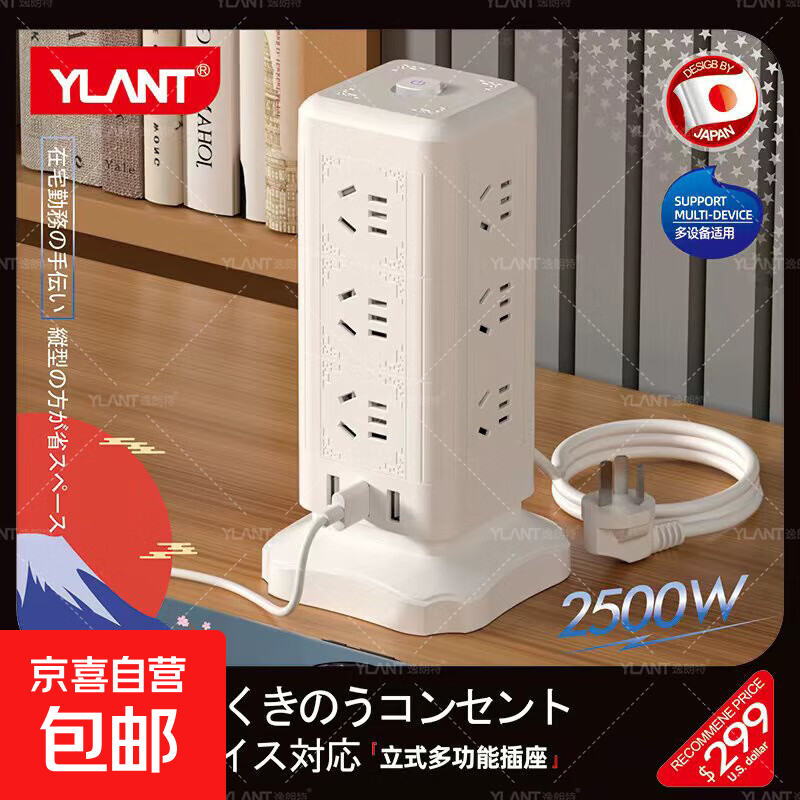 【京东物流】立式防过载过充 USB多功能转换器塔式快充插座排插办公室客厅卧室宿舍 三层12插位带USB+1.8米 立式充电塔【防过载+3C认证+加粗纯桐】