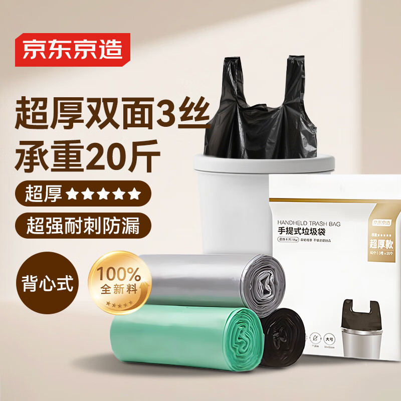 京东京造 背心式垃圾袋50*65cm*60只 超厚15μ1.5丝 手提厨房家用加厚大号