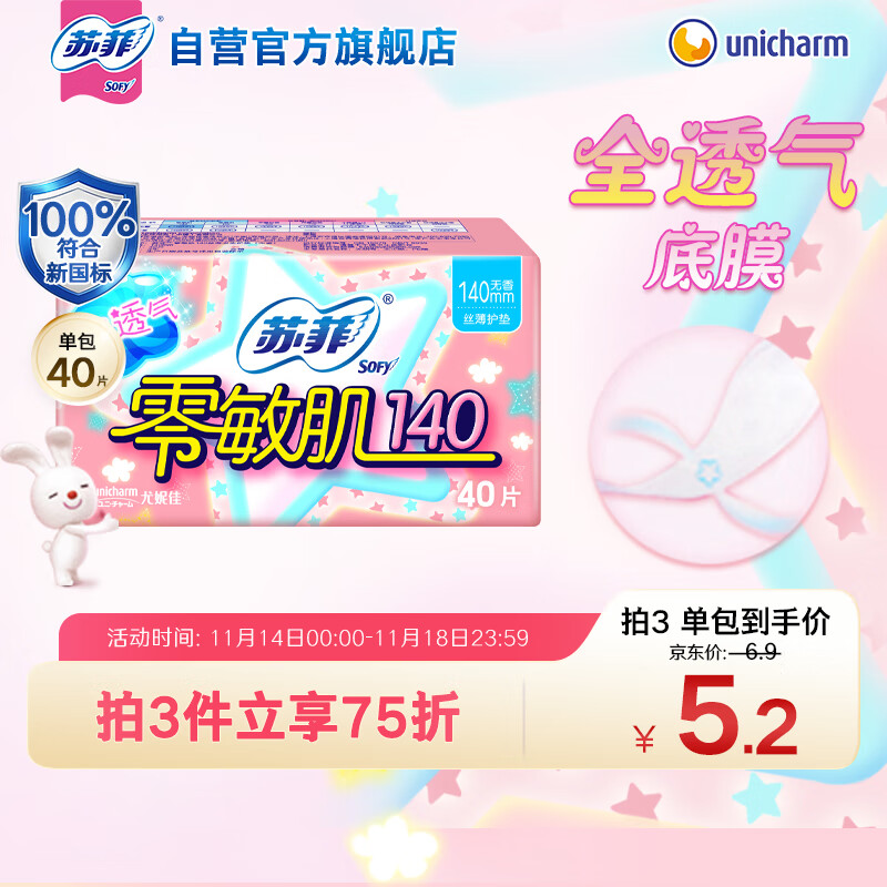 苏菲零敏肌超薄透气无香型护垫迷你卫生巾140mm 40片 丝薄棉柔姨妈巾