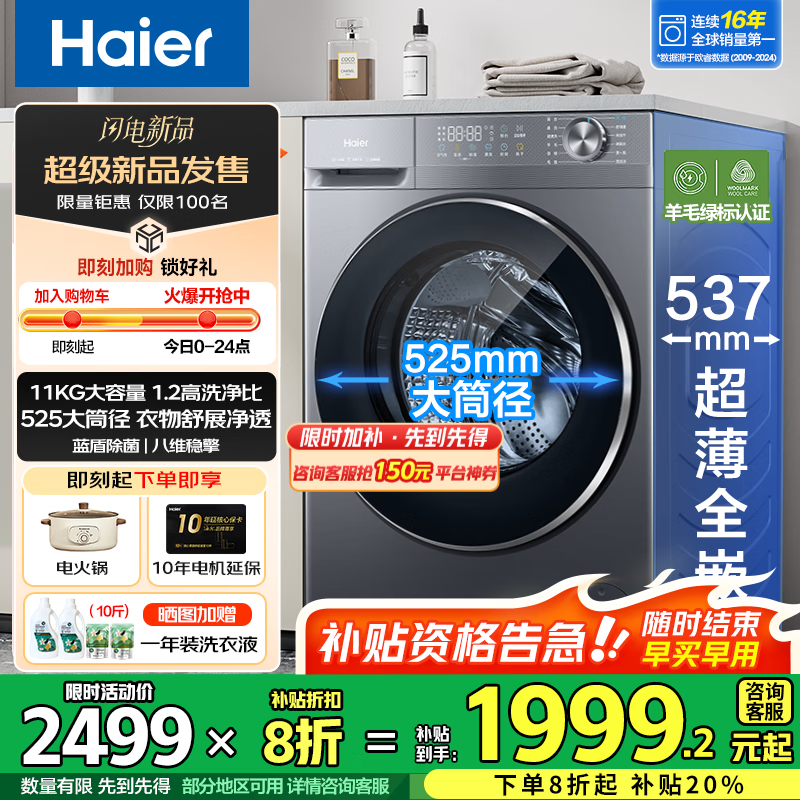 海尔(Haier)超越4.0系列11公斤58E洗衣机全自动滚筒大容量525大筒径 超薄平嵌 AI八维减震 一级能效 家电补贴 专利冲浪洗+AI八维减震+羊毛绿标+1.2高洗净比