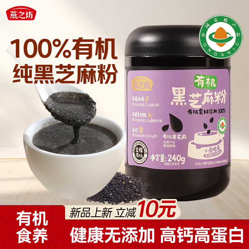 燕之坊100%有机黑芝麻粉240g熟纯黑芝麻糊无糖无添加营养早餐高钙代餐粉