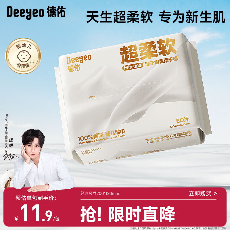 德佑超柔软100%新疆棉源柔巾婴儿洗脸巾干湿两用新生儿专用80抽1包