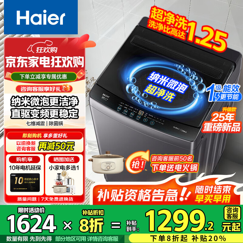 海尔(Haier)波轮全自动洗衣机直驱变频波轮洗衣机20E0纳米微泡净家用洗净比1.0出租神器国家补贴一级能效节能 12kg+直驱变频+超净洗+纳米微泡净+七维减震