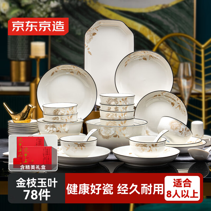 京东京造 碗盘餐具整套 景德镇碗具碟子套装乔迁之喜陶瓷礼盒金枝玉叶78头