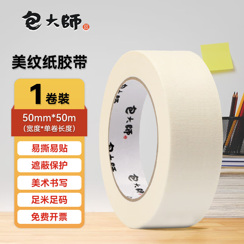 包大师美纹纸胶带50mm*50m*1卷遮蔽喷漆保护美缝无痕贴纸美术分色纸手撕纸胶带可书写