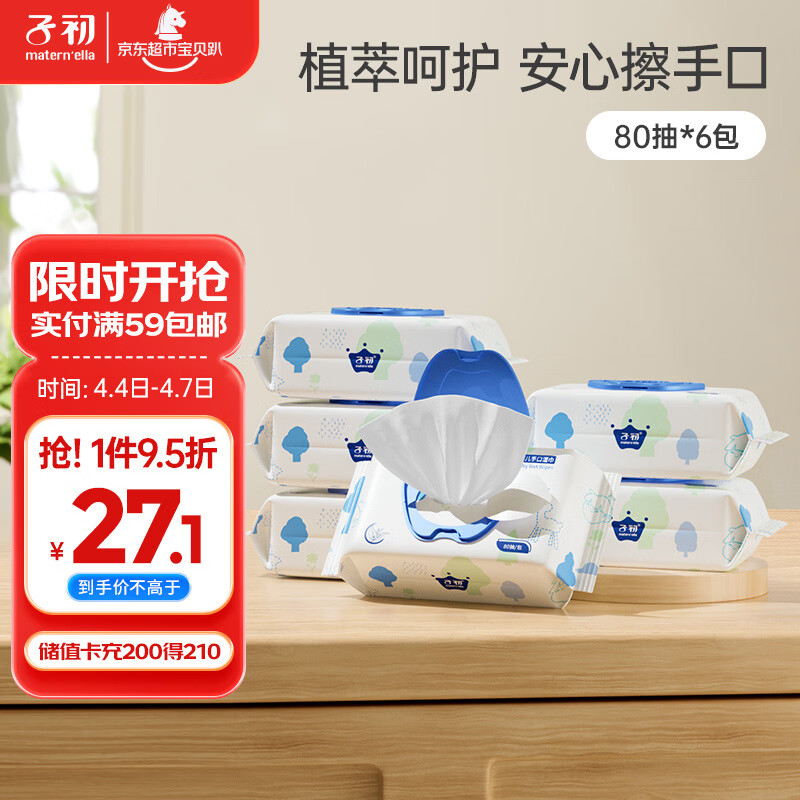 子初婴儿湿巾 新生儿湿纸巾 宝宝手口柔湿巾80抽*6包