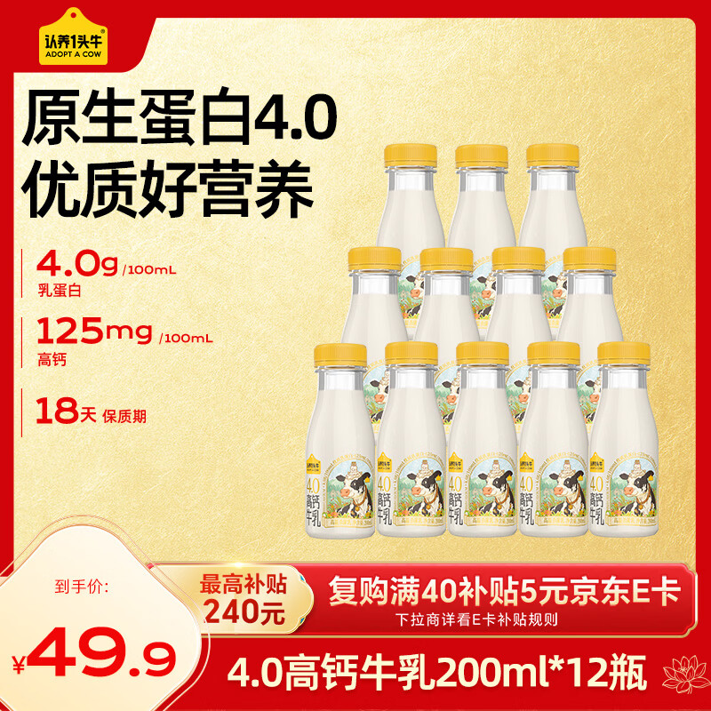 认养一头牛低温奶 荷斯坦4.0乳蛋白高钙牛乳 新鲜牛奶200ml*12瓶 源头直发