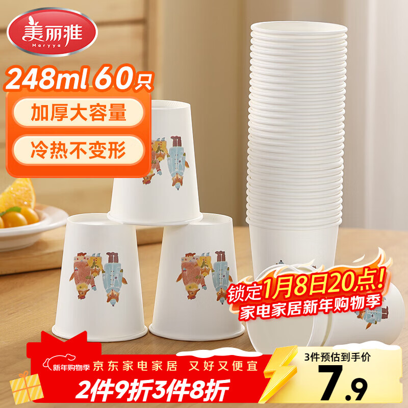 美丽雅纸杯一次性杯子 248ml*60只大号加厚食品级办公商务家用水杯