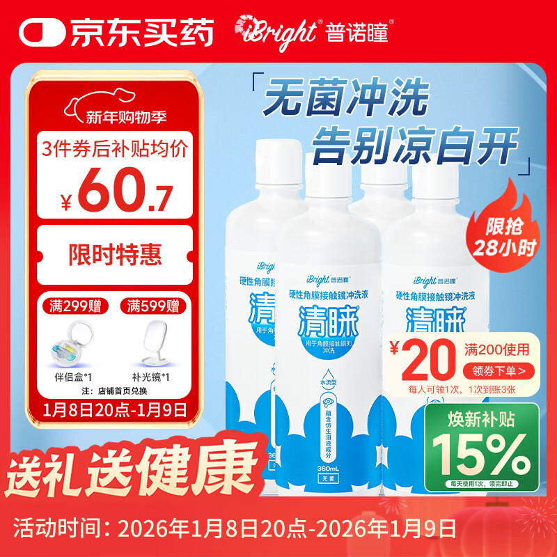 普诺瞳清睐OK镜RGP硬性角膜接触镜冲洗液生理盐水无菌冲洗液360ml*4瓶