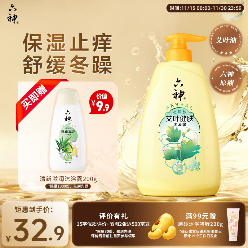 六神沐浴露艾叶止痒1kg 持久留香男士专用沐浴液乳女士保湿滋润家庭用
