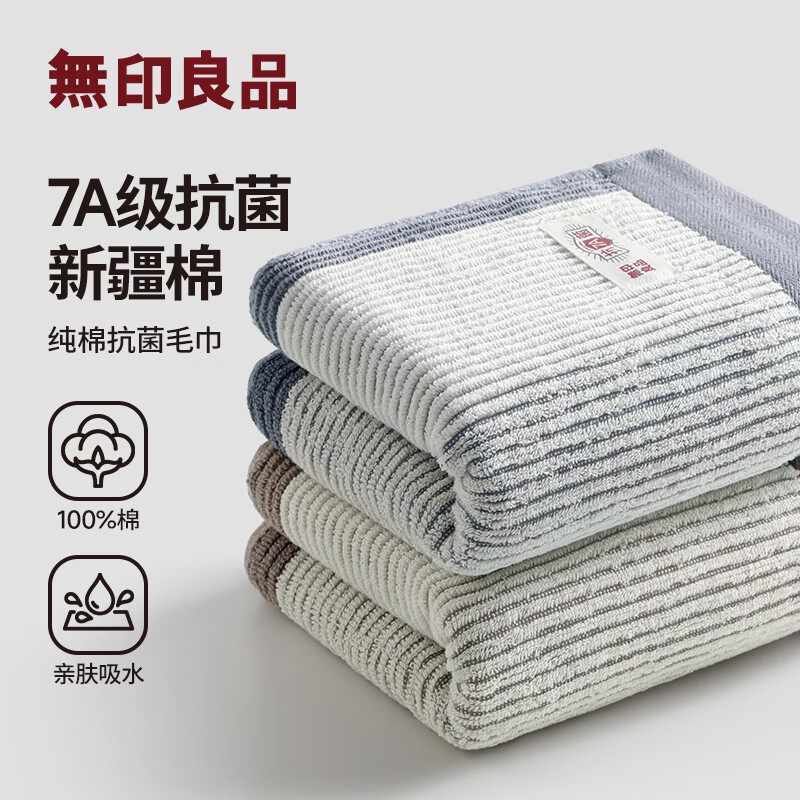 无印良品毛巾7A抗菌新疆棉男士100%纯棉毛巾不易掉毛2条装加厚柔软亲肤