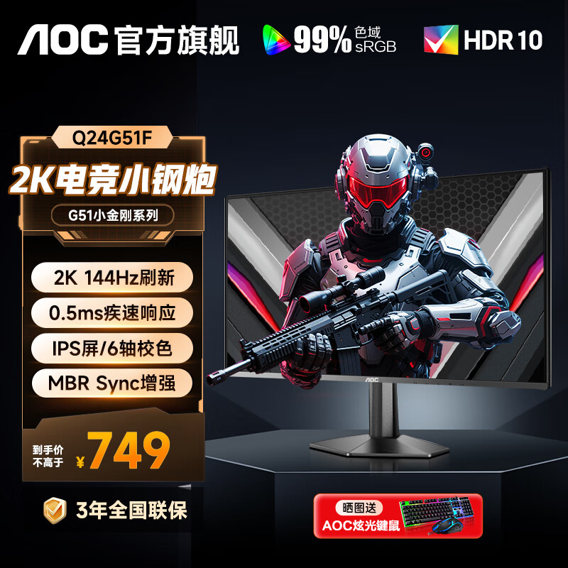 AOC 24英寸2K电竞显示器FastIPS 低蓝光1ms游戏小钢炮电脑显示屏幕HDR 【简约版】2K 144HZ Q24G51F