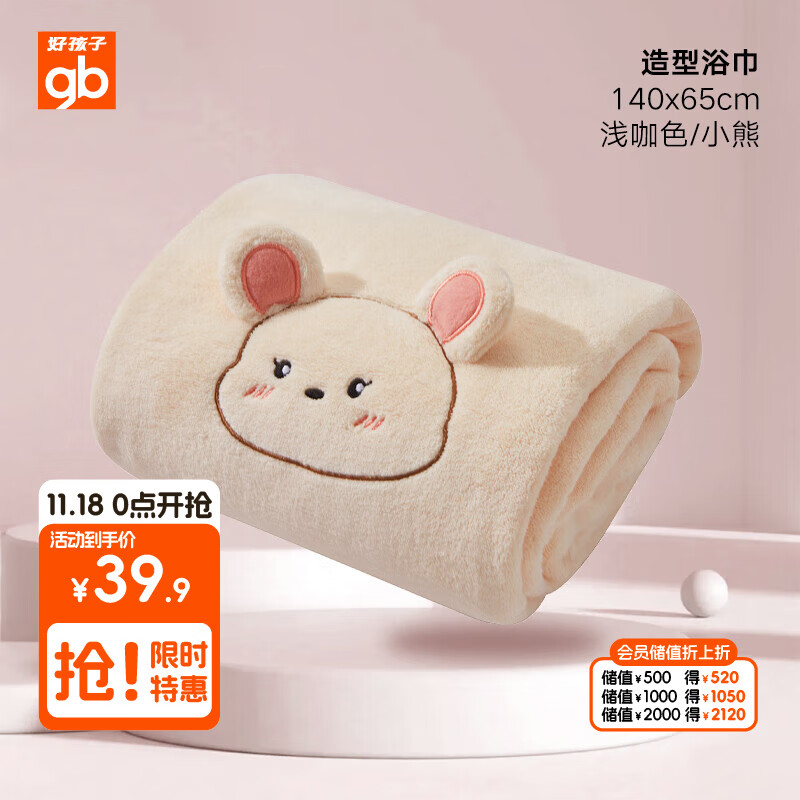 好孩子(gb)婴儿浴巾暖绒珊瑚绒吸水速干秋冬洗澡巾加大保暖儿童浴巾140*65cm