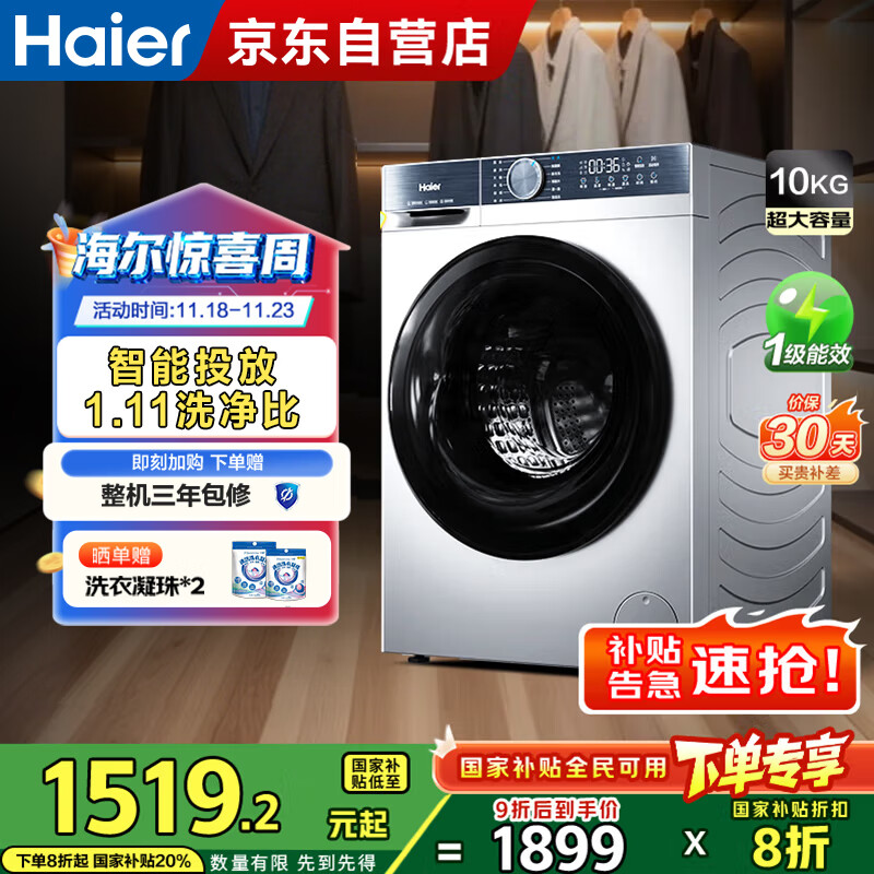 海尔(Haier)全自动洗衣机滚筒10公斤家用超薄一级能效家电国家补贴 智能投放羊毛羽绒洗XQG100-D25C