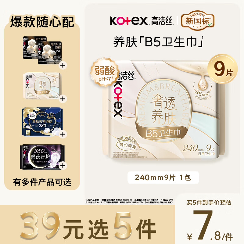 高洁丝【39元任选5件】红痒必备B5卫生巾240mm9片日用姨妈巾