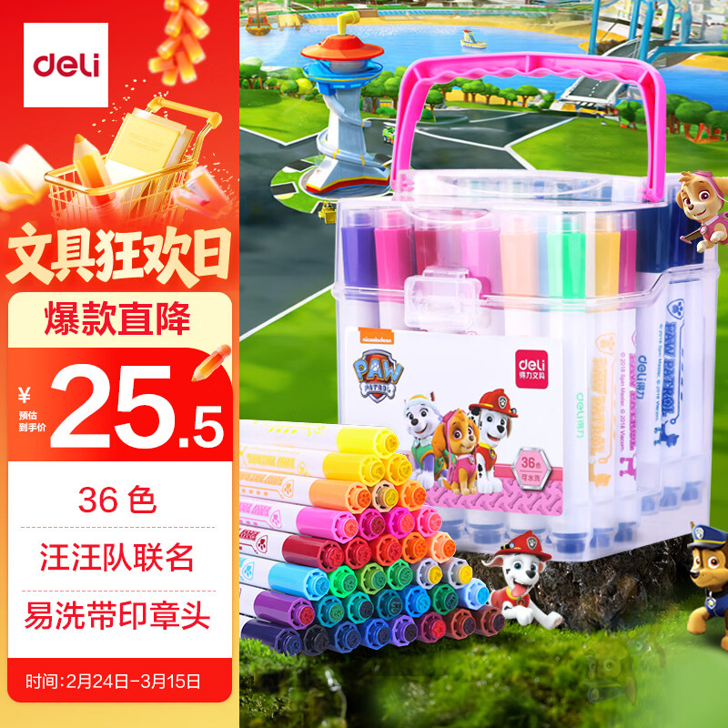 得力(deli)36色易清洗水彩笔汪汪队立大功可水洗印章头学生儿童绘画笔涂鸦画画公主粉女孩儿童礼物速写水彩笔