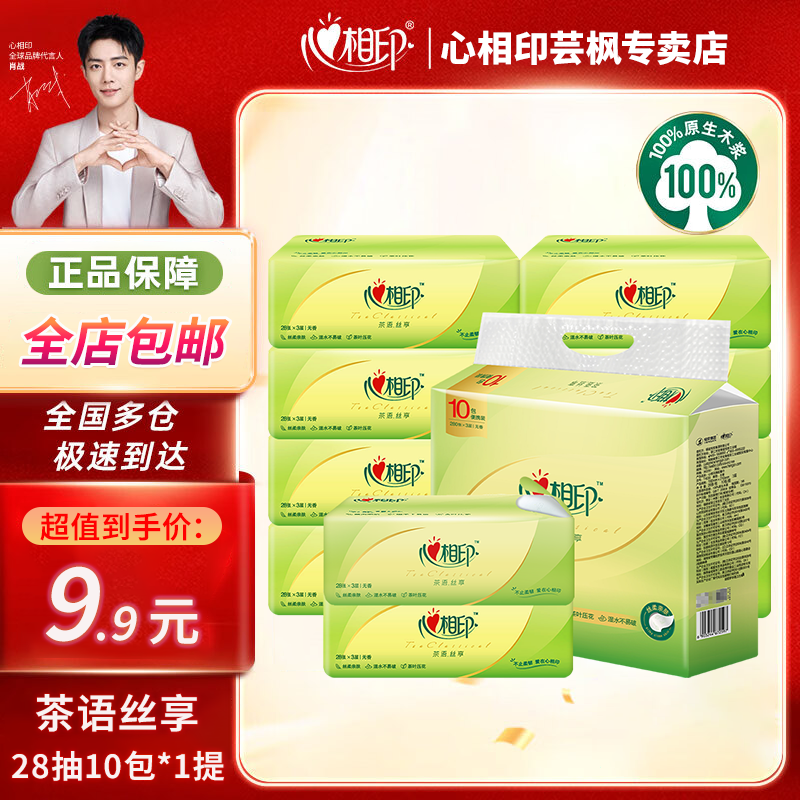 心相印茶语抽纸便携餐巾纸卫生纸擦手抽纸家用面巾纸实惠装小包纸巾 3层 28抽*10包 【提装】