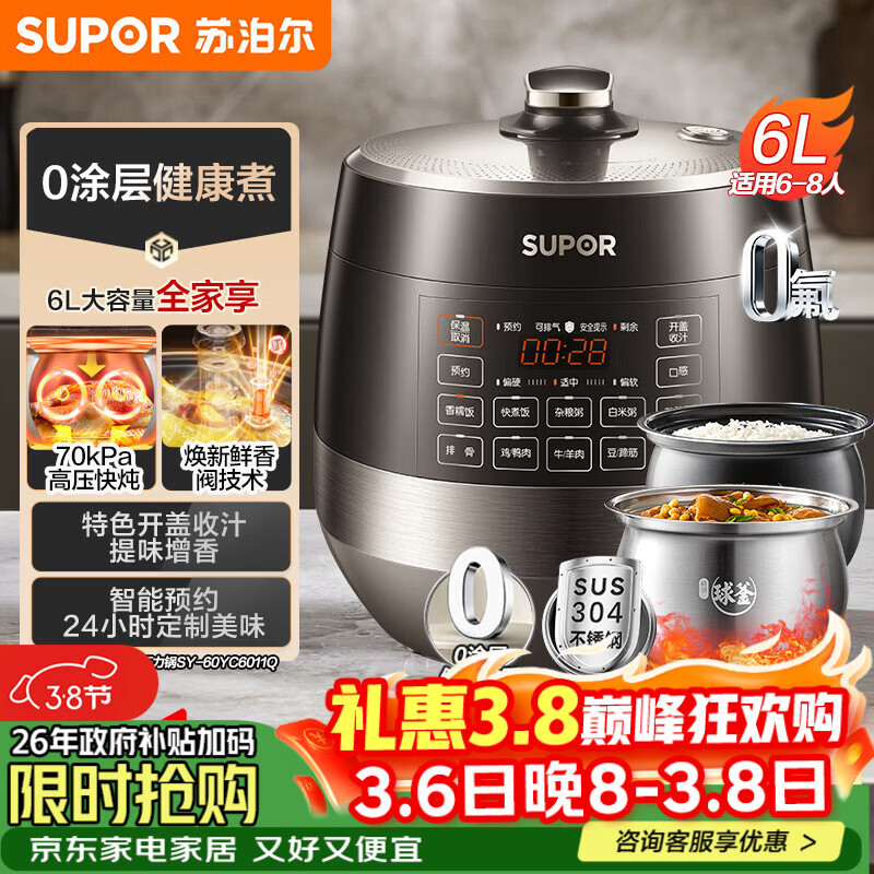 苏泊尔(SUPOR)0涂层球釜电压力锅6L双胆全自动智能预约 家用 SY-60YC6011Q电饭煲高压锅6-8人