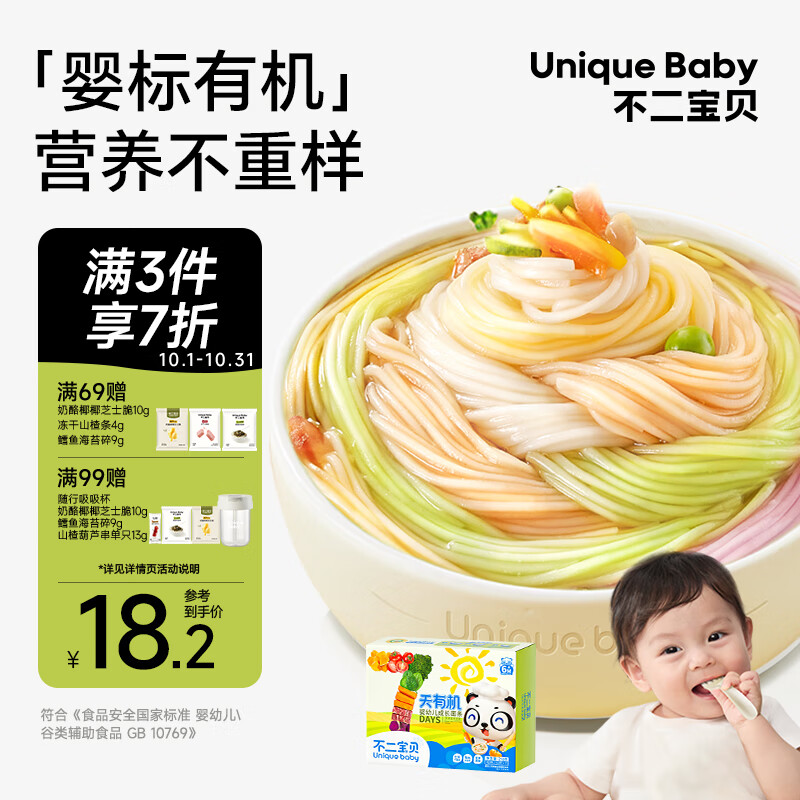 不二宝贝7天有机婴幼儿钙铁锌营养辅食面条210g儿童成长面无添加盐