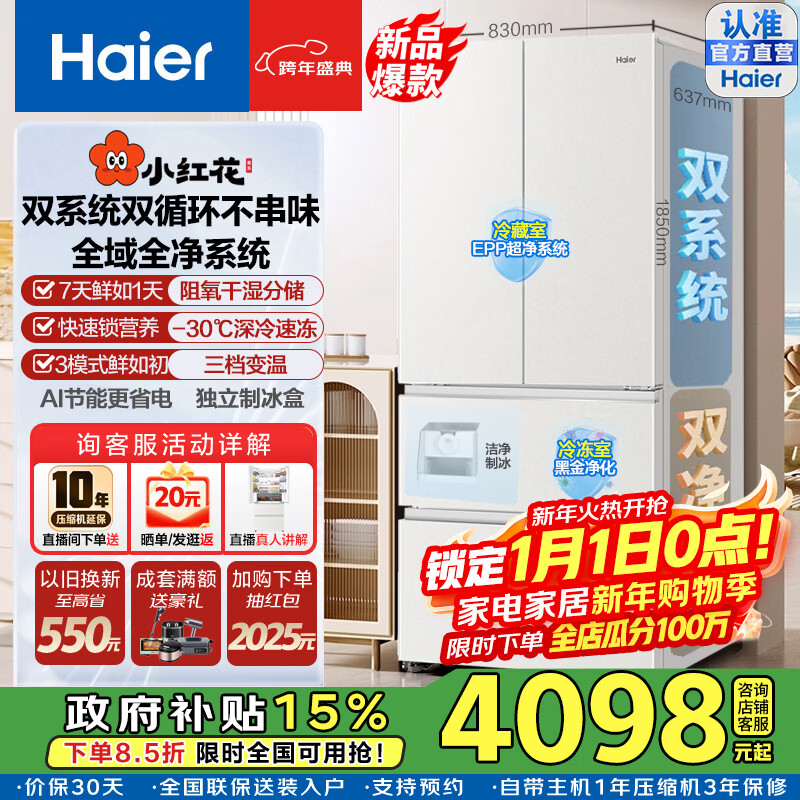 海尔(Haier)2025新款小红花541L法式多门冰箱双系统EPP超净-30℃深冷智冻干湿分储制冰大容量一级能效家用冰箱 BCD-541WGHFDC9GPU1国家补贴