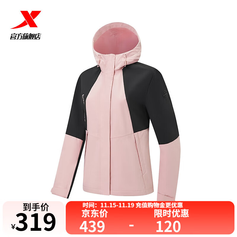 特步运动风衣女款2025秋季新款双层连帽保暖撞色外套975328160059 正黑色/铁粉色 3XL