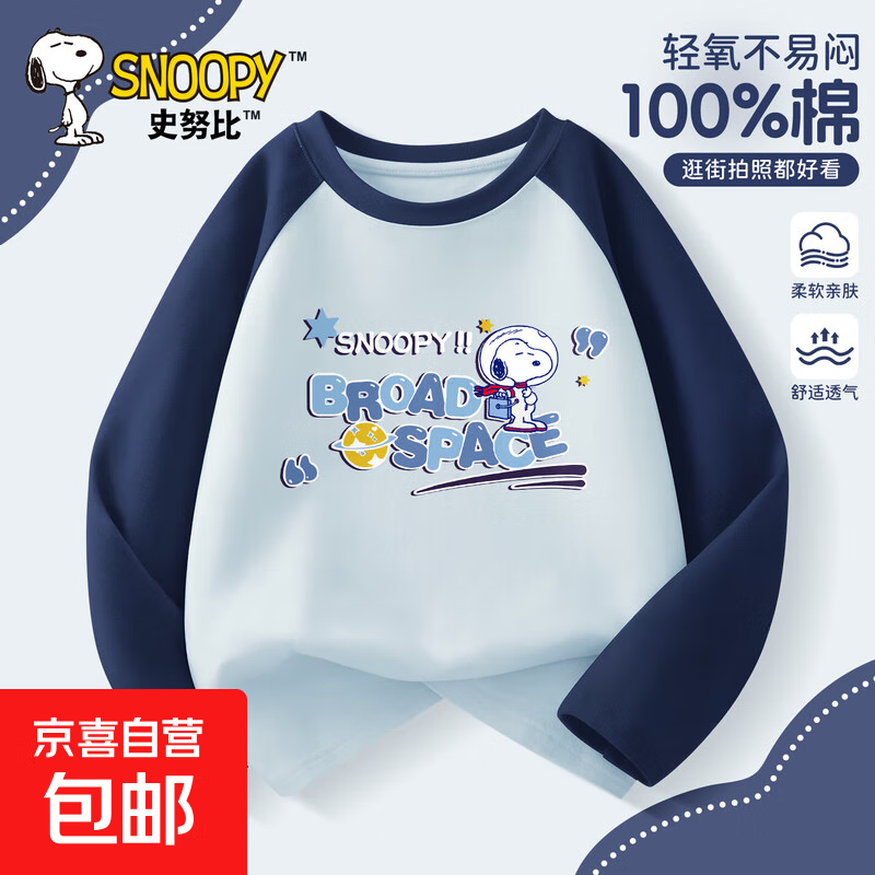 史努比(SNOOPY)男童长袖t恤春秋款2025新款纯棉童装宽松帅气上衣 星游努比云釉蓝 140