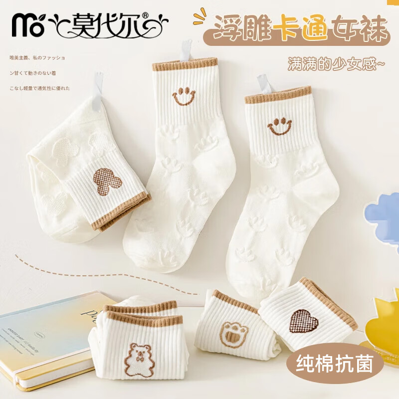 莫代尔女士袜子女夏季纯棉中筒袜抗菌防臭薄款吸汗透气学生卡通白长袜 混色 5双 均码