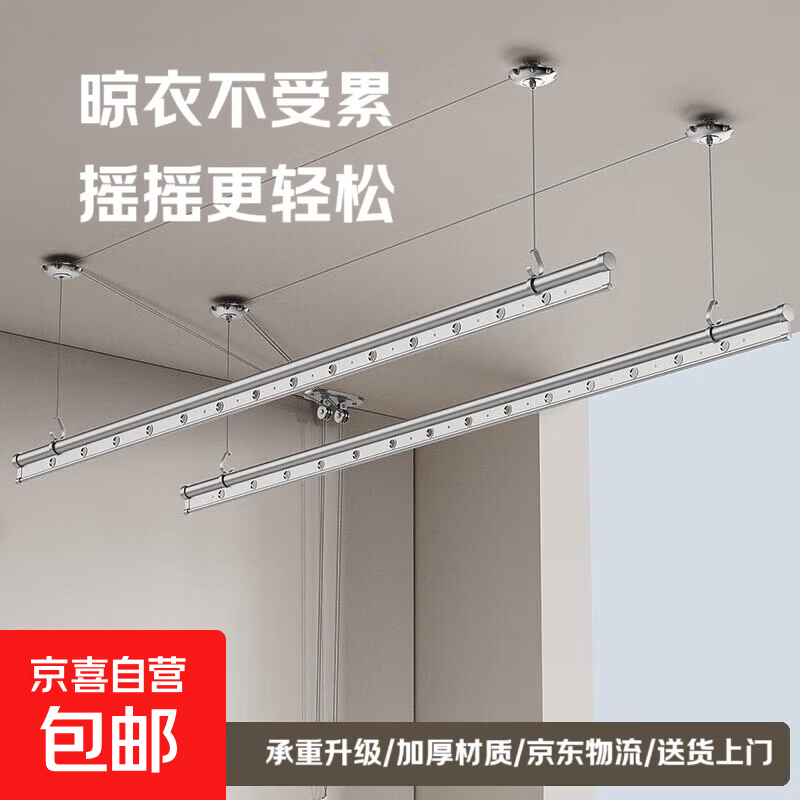 手摇升降晾衣架家用室内阳台双杆晒被干衣家用顶装式手动凉杆 银色双杆2米(包安装)