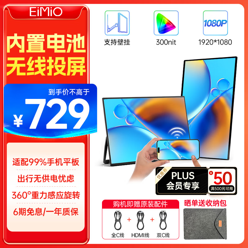 Eimio便携式显示器无线投屏 便携屏内置电池电脑笔记本副屏显示屏幕 PS5便携式手机投屏扩展屏E156W