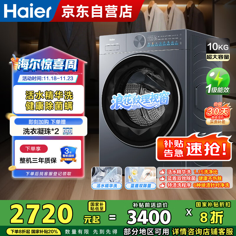 海尔(HAIER)滚筒洗衣机全自动10公斤超薄家用家电国家补贴 京东自营超越55JHU1 一级能效以旧换新内衣洗出租房