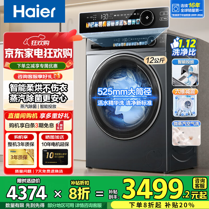 海尔洗衣机12公斤滚筒569/659超薄洗衣机全自动家用大容量活水精华洗一级能效国家补贴大筒径六维减震 12公斤洗烘一体:精华洗+空气洗+毛絮自清洁