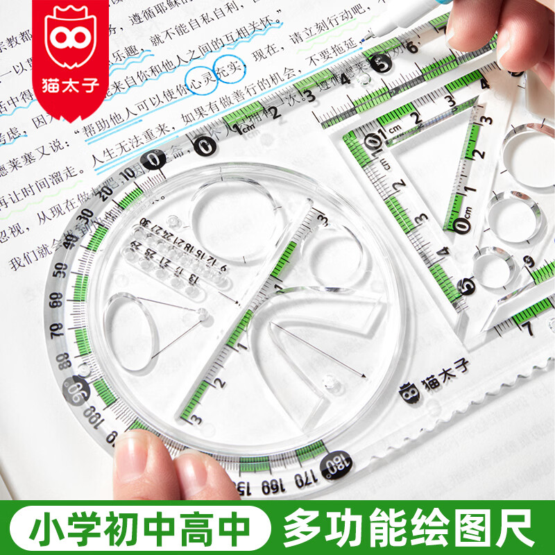 猫太子尺子多功能尺子学生专用几何绘图尺量角器几何尺几何图形画角尺旋转尺多用尺直尺 小学初中通用款