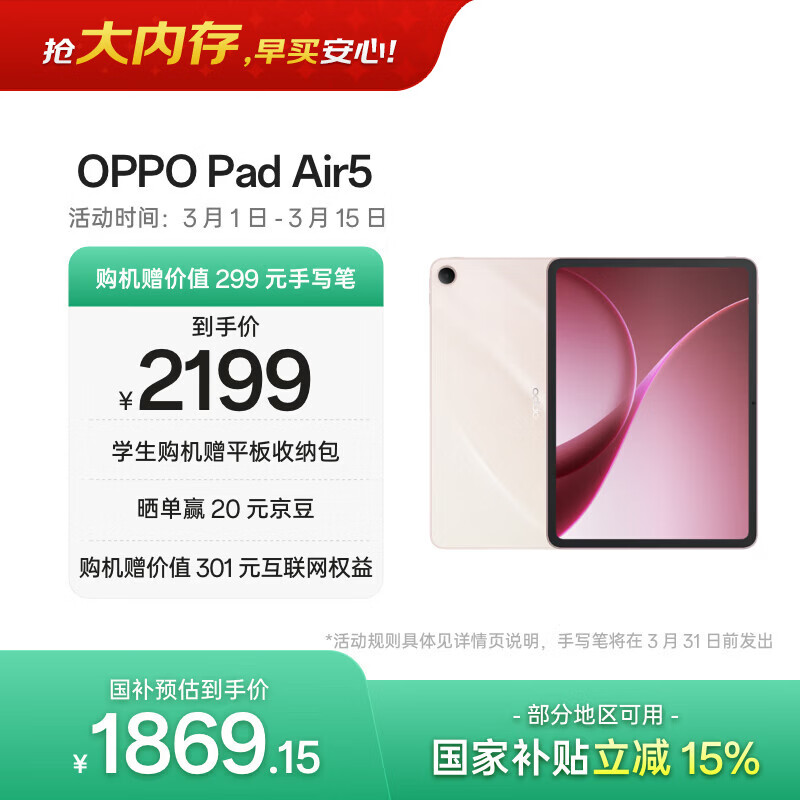 OPPO Pad Air5 国家补贴 12.1英寸平板电脑 超流畅ColorOS 8GB+256GB 星光粉 办公学习游戏娱乐平板
