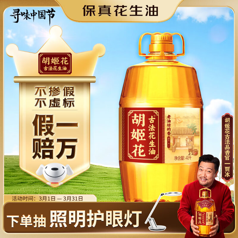 胡姬花 食用油【保真花生油】压榨 古法老油坊的香的花生油4L