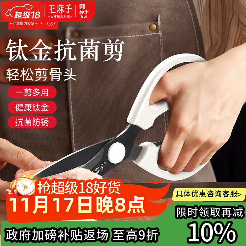 王麻子钛金剪刀厨房剪刀剪骨刀家用可拆卸剪子不锈钢食物剪刀开瓶器核桃