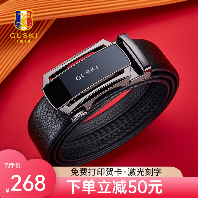 古士旗(GUSKI)法国品牌皮带男真皮自动扣男士裤腰带高档生日礼物送男友老公 枪扣气质款+头层牛皮【专柜礼盒】 115cm -130cm随机联系客服指定